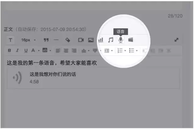 1. 运营者可以在编辑图文消息时,在正文中添加语音。一个图文消息支持添加一个语音。