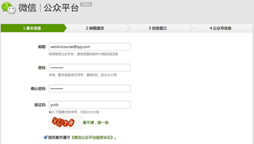 |zEF'P;_W-X;h0填写注册的邮箱(现在没有qq号注册了,个人觉得更好,新注册的qq号太长太难记)和设置密码,记得协议选项打钩,协议里有一段公众账号所有权其实是归微信所有,so这个霸王条款大家都懂的,免费的嘛。