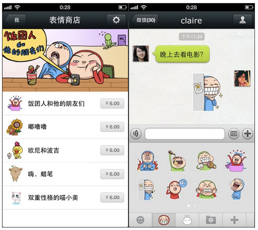 微信5.0还增加了表情商店,目前上线了五套表情,均收费6元人民币。与此同时,用户还可以自定义表情。表情商店也是微信商业化的其中一环。事实上,此举在日本同类竞品Line中早已经实现。