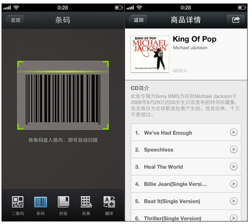 如此前所知,微信5.0版本加强了“扫一扫”功能,不仅限于二维码扫描,还可以扫条码、图书和CD封面、街景,甚至通过单词扫描进行即时翻译。
