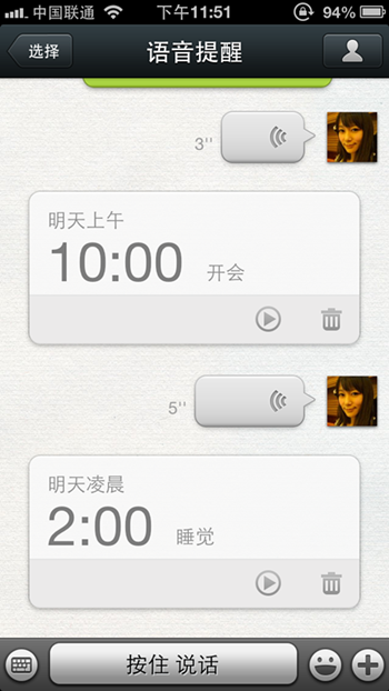 你可以通过语音创建简单的提醒,一定要附带时间信息,这样到时候微信就可以推送提醒消息,不过还可以改进的一点就行,提醒应该是有提前量的,微信应该可以考虑,提前5分钟或者10分钟进行提醒。