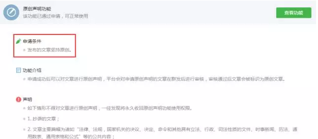 很多在埋头原创的公众号问得最多的就是这个问题了,但目前原创声明功能仍处于内测阶段,真的只能由官方邀请开通。后台功能申请条件里只有“发布的文章坚持原创”简单九个字。