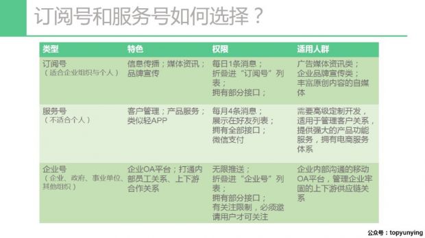 笔者发现很多刚入门的微信公众号从业者对微信没有一个基本的了解,都是自己一步一步误打误撞的走过来。而现在很多文章没有那么全面的介绍微信运营的基础建设,所以这篇文章就会将微信公众号的基础建设与规划做一个细致的入门讲解。微信公众号的区别在哪里?